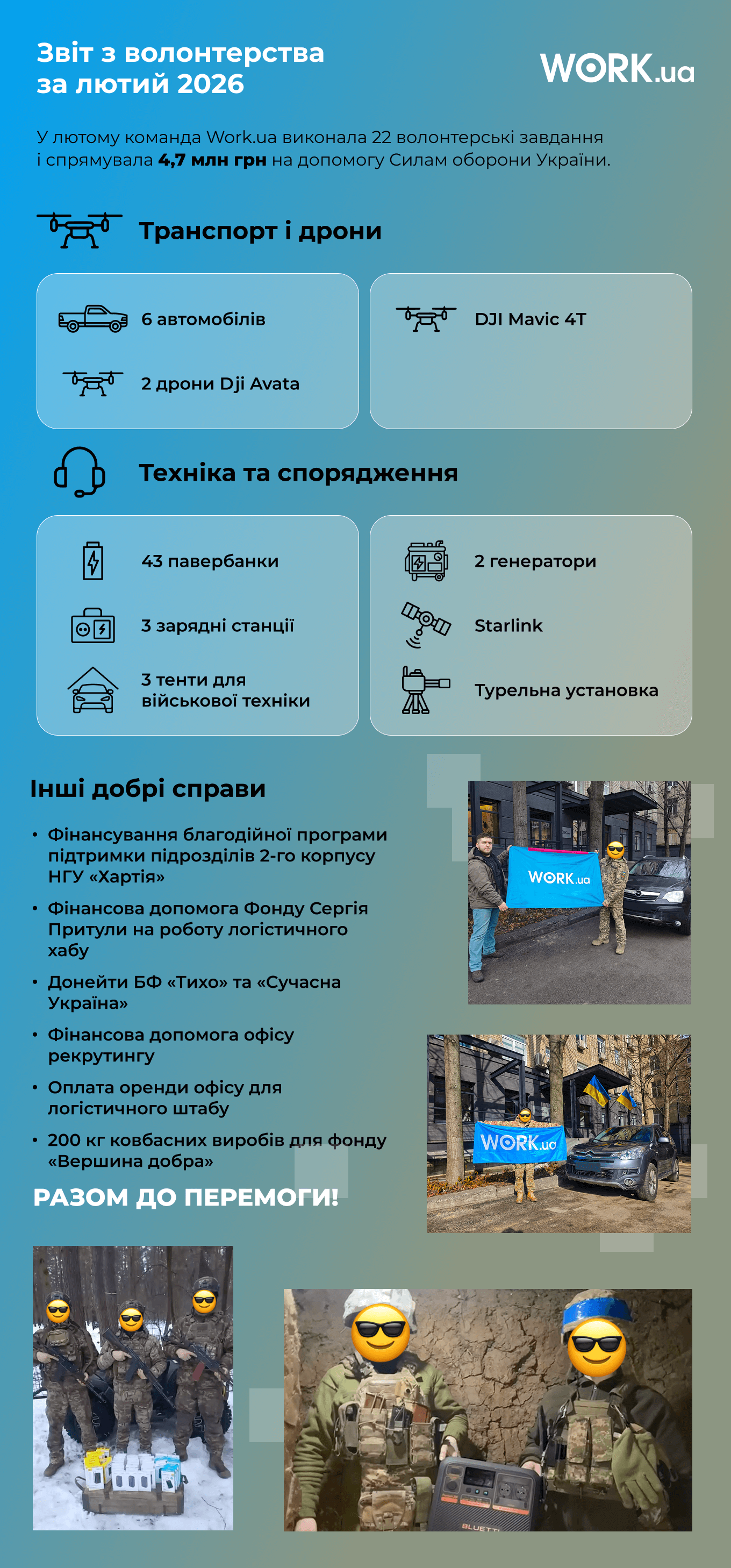 | | 4 березня 2026 | | Як Work.ua допомагав Силам оборони у лютому | | Кожне створене резюме, кожна розміщена вакансія, кожен клік на Work.ua у лютому перетворювався на авто, дрони, генератори та іншу необхідну техніку. Нам вдалося виконати 22 волонтерські завдання й спрямувати майже 5 млн грн на допомогу війську. | | | | | |